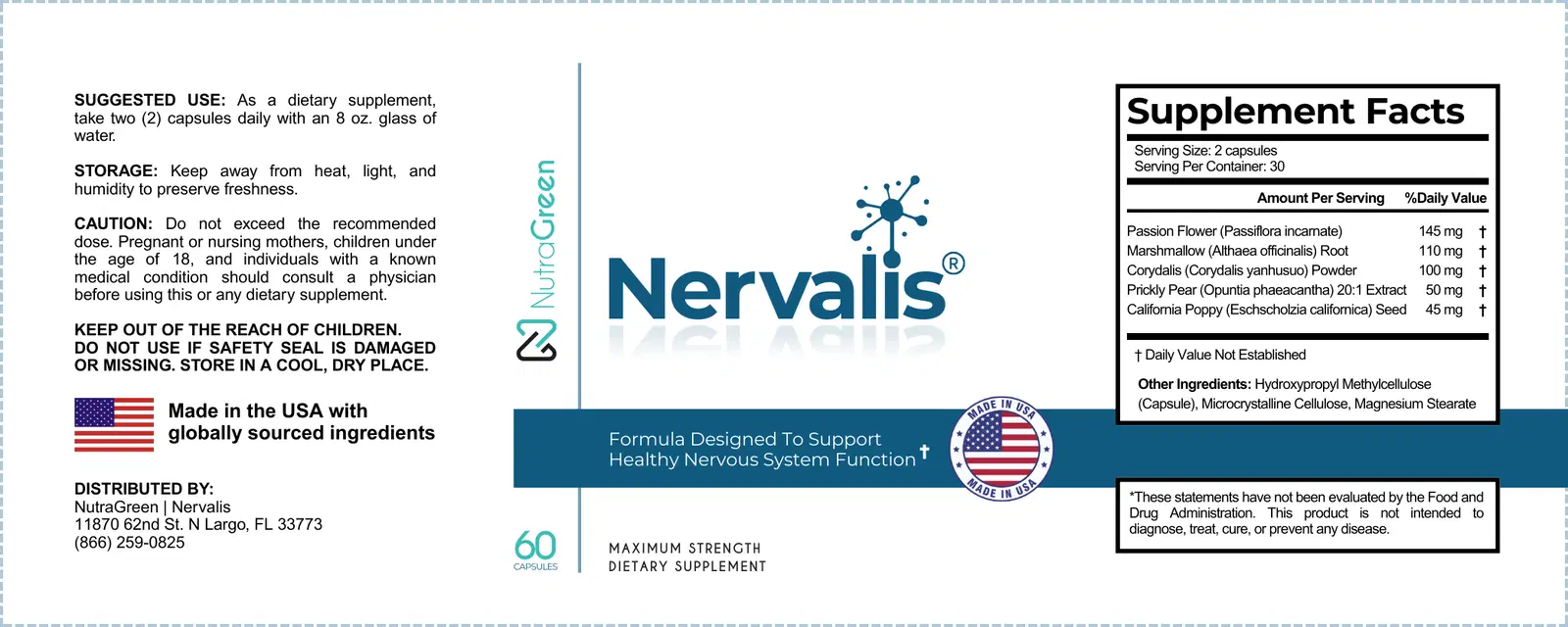 Nervalis carries the NutraGreen Quality Seal. For 12 years, we’ve stood behind our customers’ complete satisfaction. Try Nervalis for a full 60 days. If you’re not thrilled for any reason, simply return the bottles—used or unused—and you’ll receive a prompt, full refund. No questions asked.